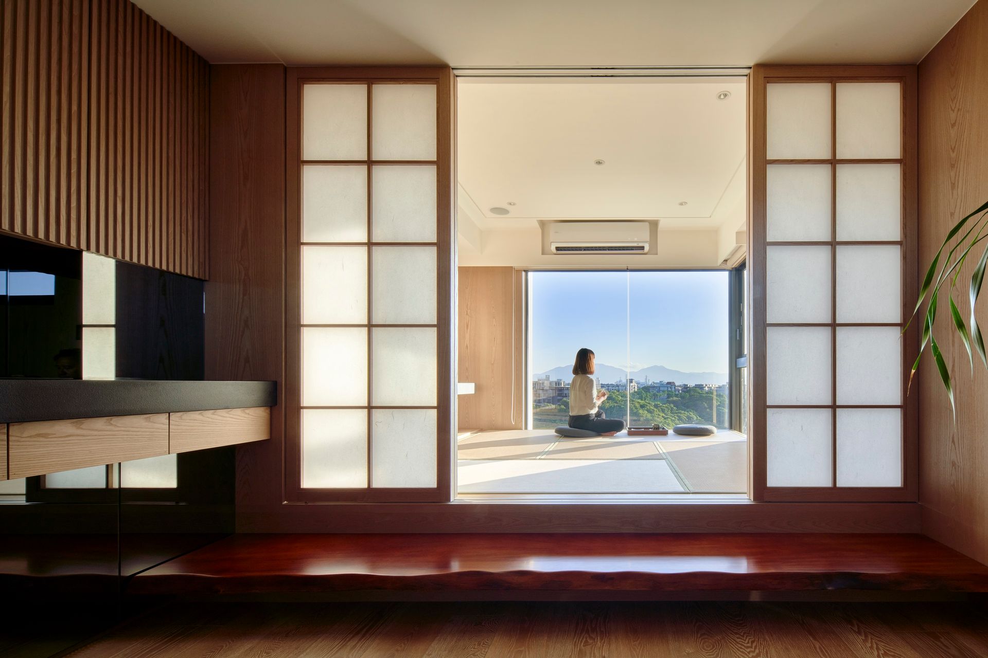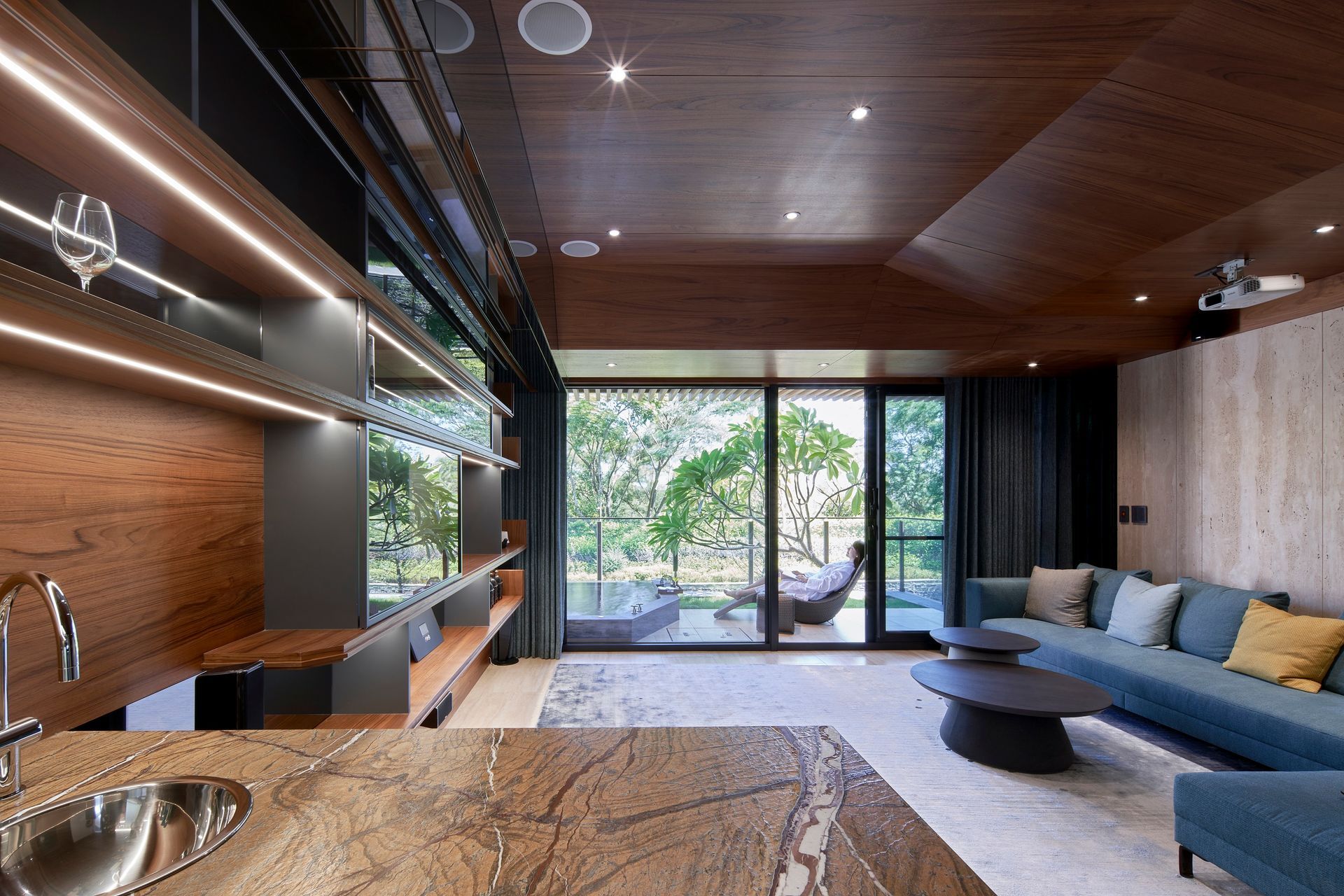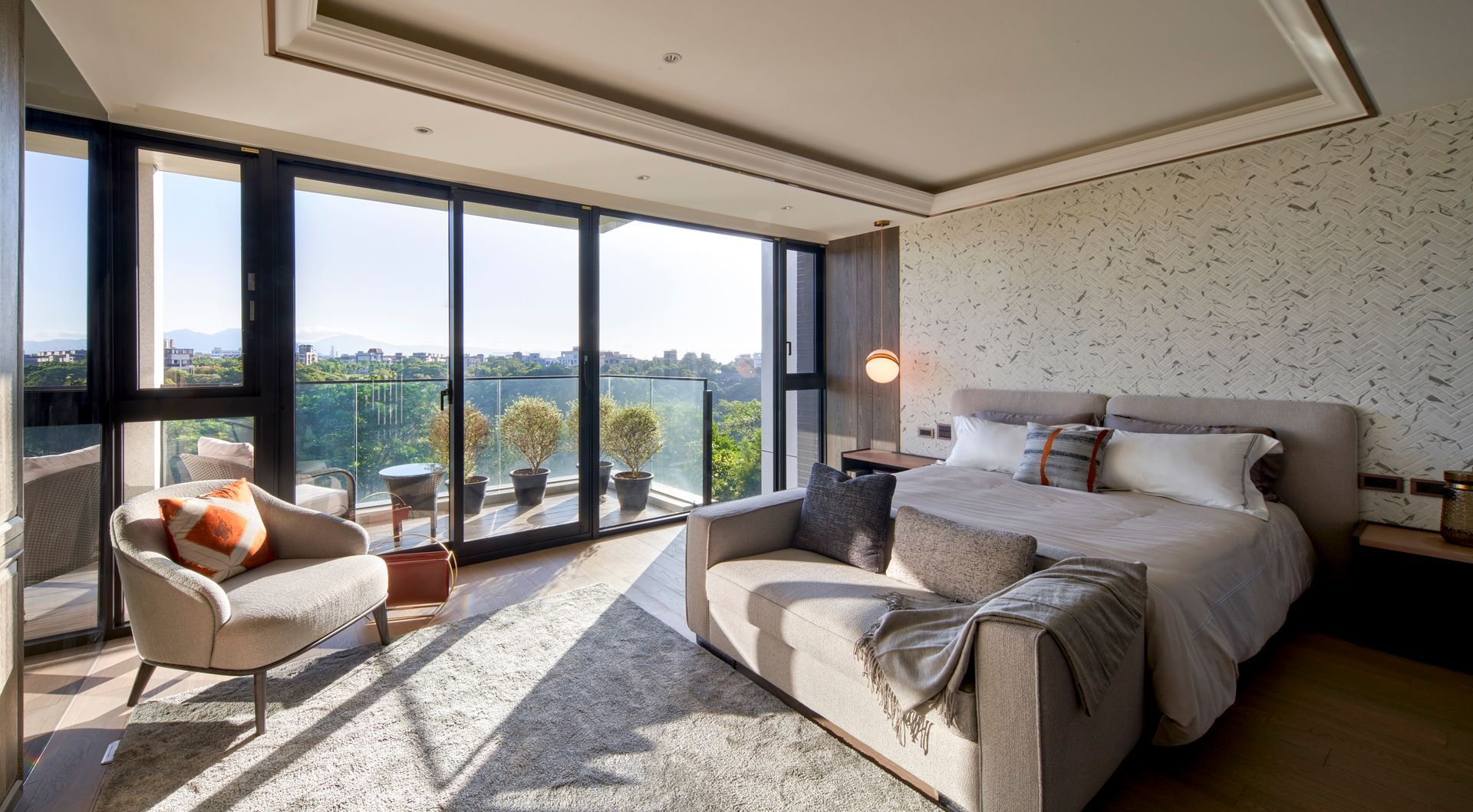 本案為一座舒適放鬆的度假別墅,創造的不僅是高端住宅的生活方式,更傳遞了精緻的多元休閒生活理念。從車行入口至地下玄關的過渡區,以大面石材營造出低調且具儀式感的歸家體驗。作為交誼客廳、宴客餐廚區及庭院的一樓,運用前後開景及水幕牆,加強了室內外的景觀聯動。兼容接待與起居的二樓,設有木質露臺及SPA池,加上精緻酒櫃、頂級影音室等設施,賦予高品質的生活享受。考量三、四樓各自樓層高度與景觀視野的契合度,兩間臥房分別以現代時尚、溫馨敞闊的形式來迎接不一樣的窗外景色。規劃為和室及書房的五、六樓,輔以休閒露臺與臥榻,讓此地成為一家人交流互動的核心場域,亦進一步消除了人與自然的隔閡,帶領居者感知四季的不同、朝暮的變化。