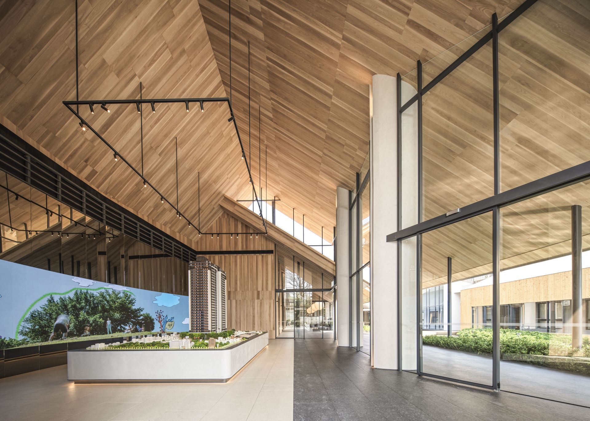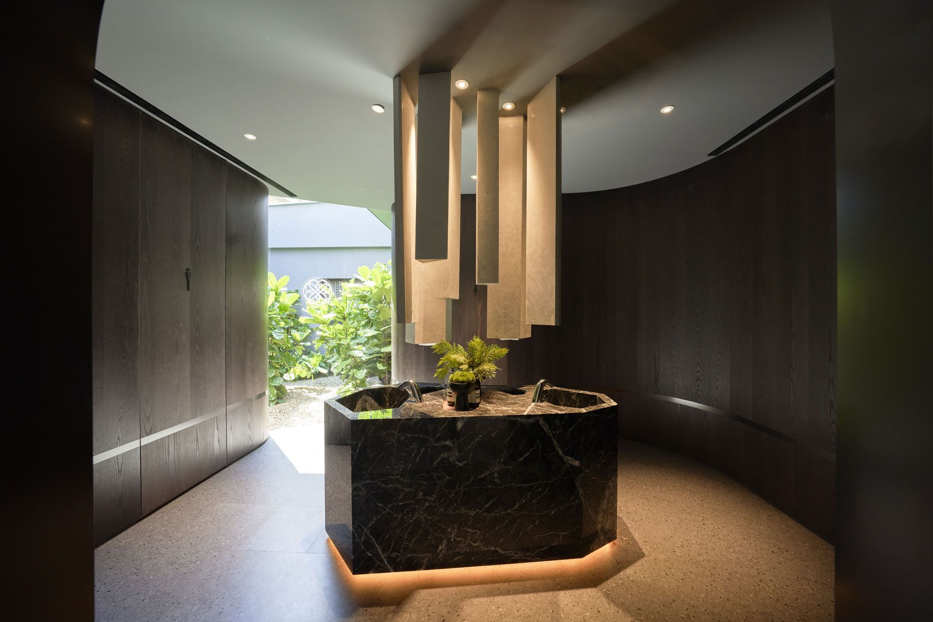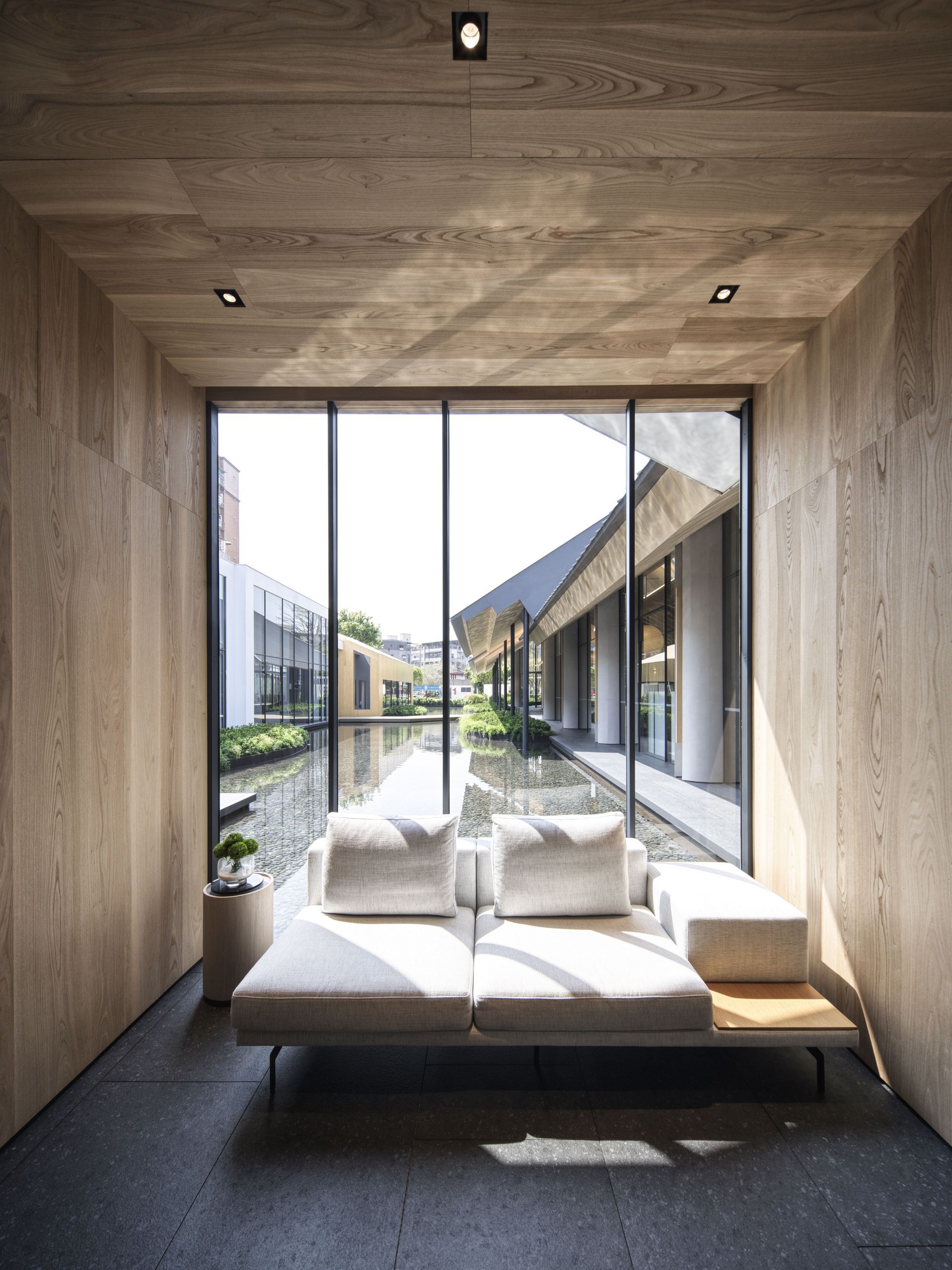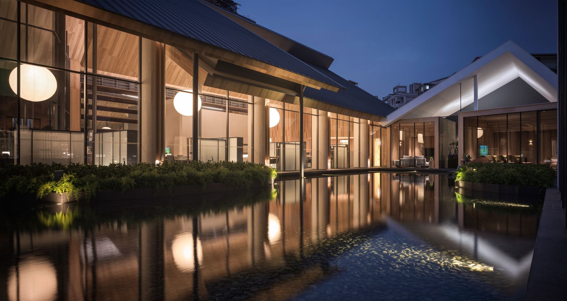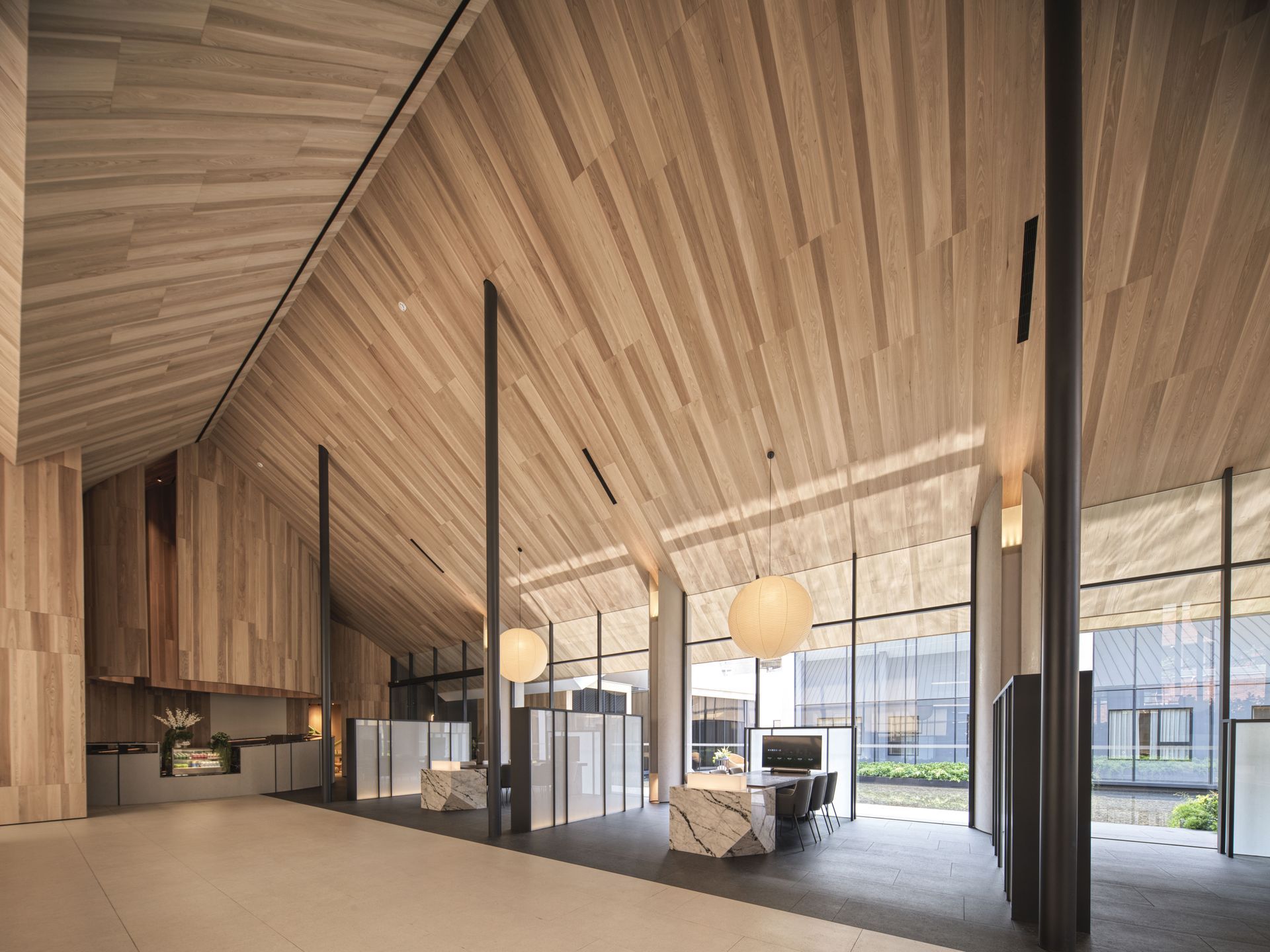 This design features a seamless sloped roof that elegantly extends across the space, complemented by an arced skylight above the bar area, enhancing the sense of lightness and fluidity. Instead of recessed lighting, the ceiling is illuminated by large lantern-like fixtures that diffuse the light softly. Their glow, mirroring rippling water patterns, dances across the surface as daylight shifts, adding a serene and poetic ambiance to the environment.