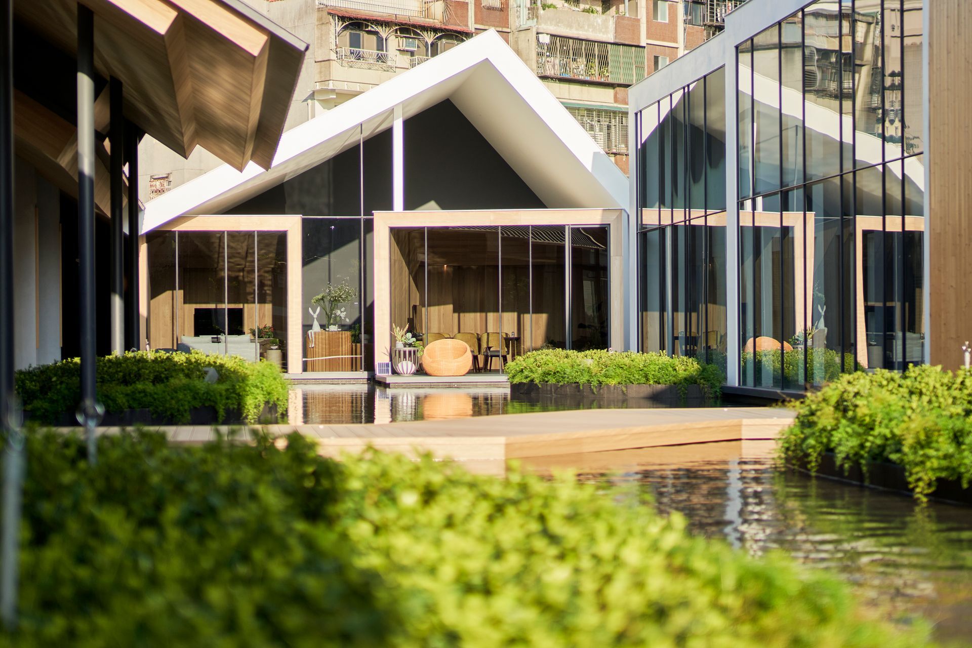 水道串聯街道,強化社區連結。大屋頂經精細設計,兼具遮陽與通風機能,營造宜人微氣候,使建築成為舒適且具人文溫度的生活場域。