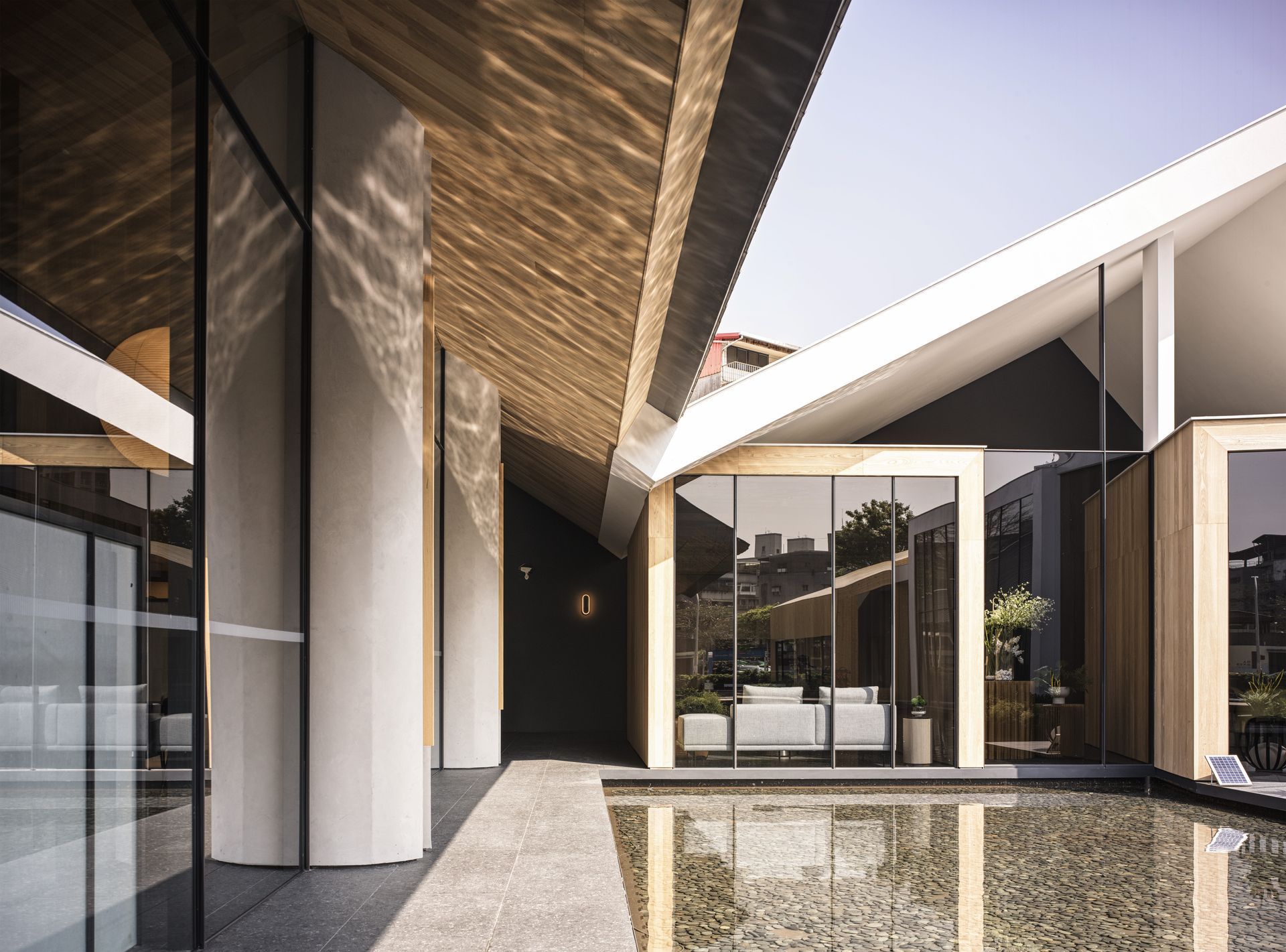 此案採聚落式設計,以黑、白、木色為基調,透過異材質與體量錯落,營造現代且溫潤的建築語彙。入口燈光借鏡美術館,以吊燈與木質面板反射,形塑柔和光影層次。