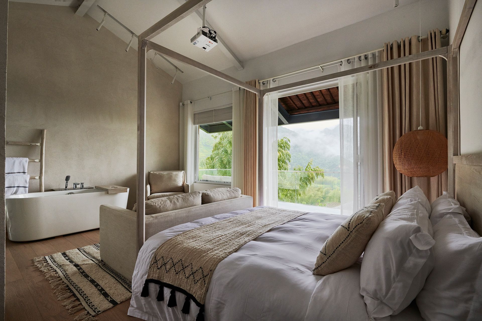內部空間則以峇厘島式輕鬆生活的精神重建,以白色為基調呼應雲的色彩,80%的新與20%的舊,加入大量觀景窗,讓山景流入室內,保留黃土牆、舊門片,加上仿古擺設。擷取簡約精神,加上大量棉麻材質的軟件使用,提升居住品質,強化人與自然的因素,讓遊客來此不只打卡,而是在心上留下於此的生活記憶。